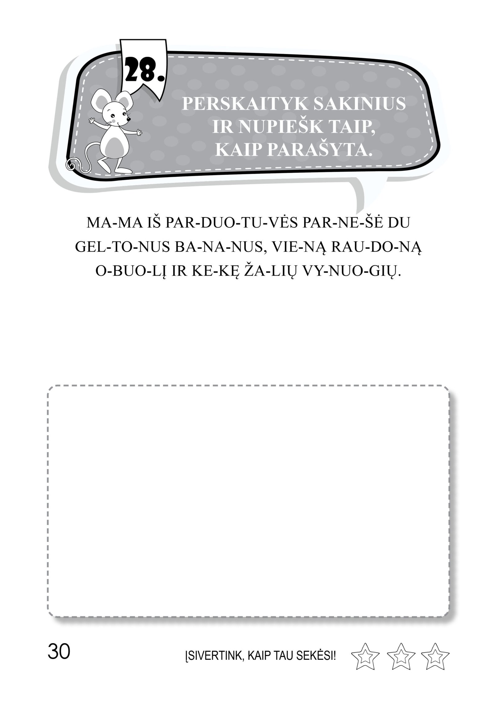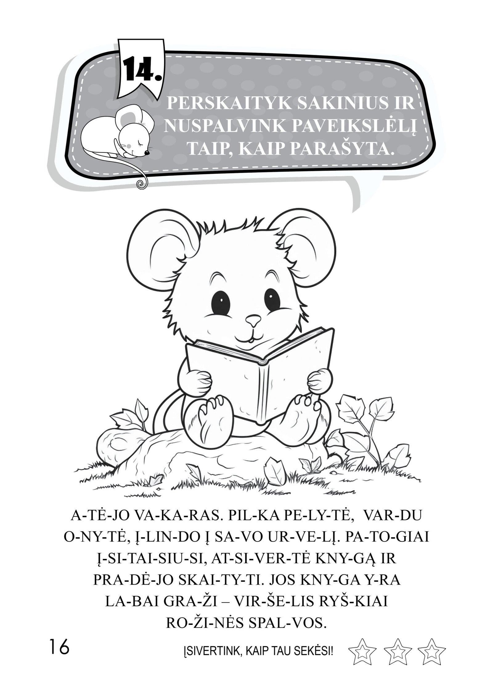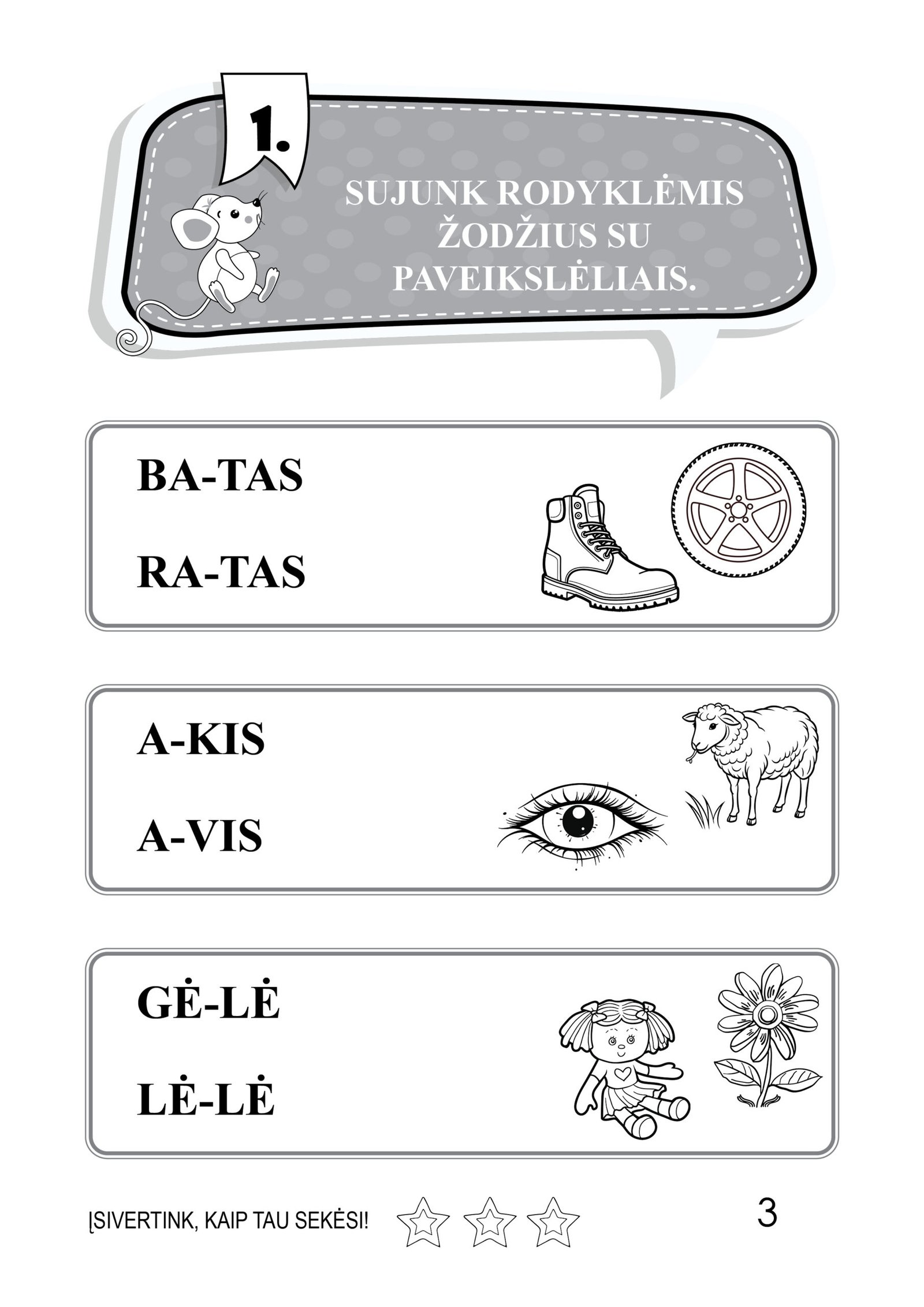 Užduočių knyga skirta priešmokyklinukams ir pirmų klasių mokiniams, kurie patiria sunkumų mokydamiesi skaityti, suprasti tekstą. Knygoje esančios užduotys padės lavinti skaitymo, fonologinio suvokimo (panašiai skambančių žodžių siejimo) ir teksto suvokimo įgūdžius. Leidinyje pateikiamos trijų skirtingų tipų užduotys: pirmo lygio užduotyse vaikai skatinami perskaityti skiemenuotu tekstu parašytus panašiai skambančius žodžius ir surasti tinkamą paveikslėlį. Antro lygio užduotyse pateikti trumpi ir smagūs skiemenuoti tekstai. Juos perskaitę, vaikai kviečiami nuspalvinti paveikslėlį taip, kaip parašyta tekste. Trečio lygio užduotyse pateikti vaizdiniai diktantai: vaikas skatinamas perskaityti skiemenuotą tekstą ir nupiešti viską tiksliai taip, kaip parašyta. Po užduoties atlikimo vaikai galės reflektuoti ir įsivertinti darbą. Tai padaryti padės įsivertinimo žvaigždutės lapo apačioje.